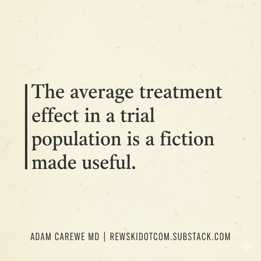 The average treatment effect in a trial population is a fiction made useful. It smooths across outliers, enrollment criteria, dropout rates, and populations that look nothing like the patients most of us actually see. The gap between trial eligibility and real-world patients, particularly those with multiple chronic conditions, low income, or non-dominant cultural backgrounds, is not a footnote. It’s the job.